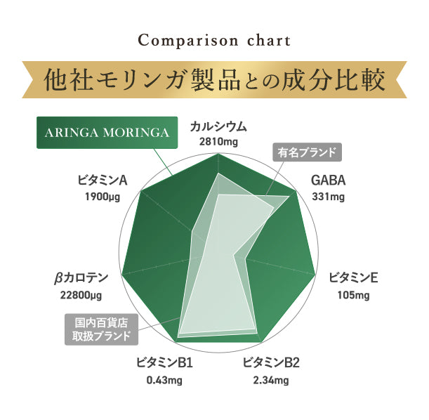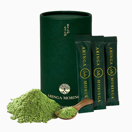 ARINGA MORINGAには、90種類以上の栄養素が含まれ、特に注目なのが、美肌やインナーケアにも嬉しいビタミンAとC、βカロテン、ビタミンE食物繊維です。これらのビタミンは、シワやくすみの原因となる活性酸素の発生を防ぎ食物繊維をバランスよく含むため、腸内環境が整いやすく、肌のターンオーバーに必要な栄養素がしっかりと吸収され、肌のみずみずしさを保ってくれます。